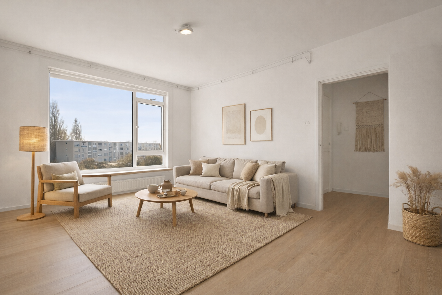 Bij binnenkomst treft u een lichte woonkamer.